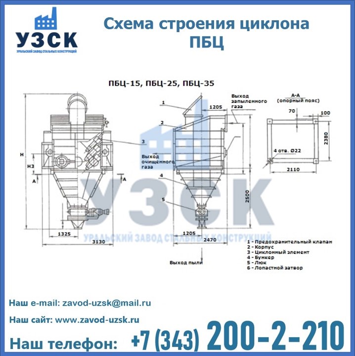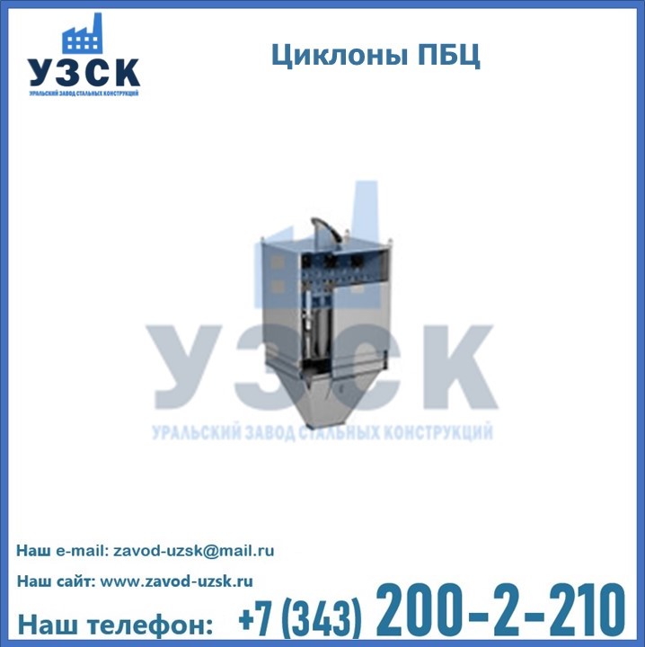 Завод «УЗСК» в Серпухове предлагает приобрести циклоны ПБЦ и прочие устройства, полностью укомплектованные и готовые к эксплуатации. Мы гарантируем соответствие оборудования всем требованиям ГОСТ и ТУ, износостойкость и высокую производительность предлагаемого оборудования. Уральский Завод Стальных Конструкций изготавливает и продает надежное, эффективное и производительное оборудование, имеющее длительную гарантию и большой эксплуатационный ресурс. Если требуется изготовить циклон нестандартных размеров, то такой вариант выполнения заказа тоже предусмотрен, так как предприятие имеет собственные производственные площади и надежных поставщиков. На все поставляемое или производимое оборудование имеются чертежи и прочая техническая документация. Заказать и купить циклоны или прочее оборудование высокого качества и по доступной цене можно через наш сайт или по указанному в разделе «Контакты» телефону.