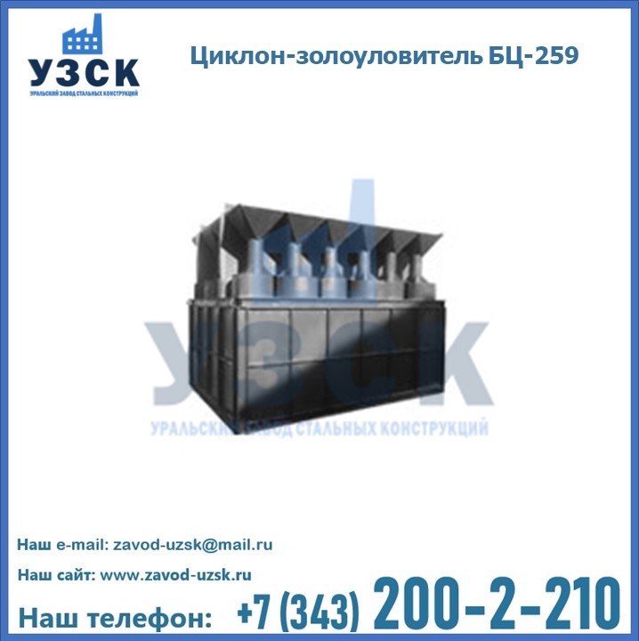 Если вы планируете купить то или иное оборудование, например, циклоны-золоуловители БЦ-259, то рекомендуем заказать данный товар на сайте УЗСК. Мы производим и реализуем продукцию высокого качества по приемлемой цене. Эксперты Уральского Завода Стальных Конструкций в Серпухове проконсультируют вас по всем вопросам, помогут сделать выбор и оформить заказ без лишних временных затрат. Мы гарантируем соответствие нашей продукции всем требованиям ГОСТ и ТУ, а также износостойкость и высокую производительность предлагаемого оборудования. Если требуется изготовить циклон нестандартных размеров, то такой вариант выполнения заказа тоже предусмотрен, так как предприятие имеет собственные производственные площади и надежных поставщиков. На все поставляемое или производимое оборудование имеются чертежи и прочая техническая документация. Заказать и купить циклоны или прочее оборудование высокого качества и по доступной цене можно через наш сайт или по указанному в разделе «Контакты» телефону.