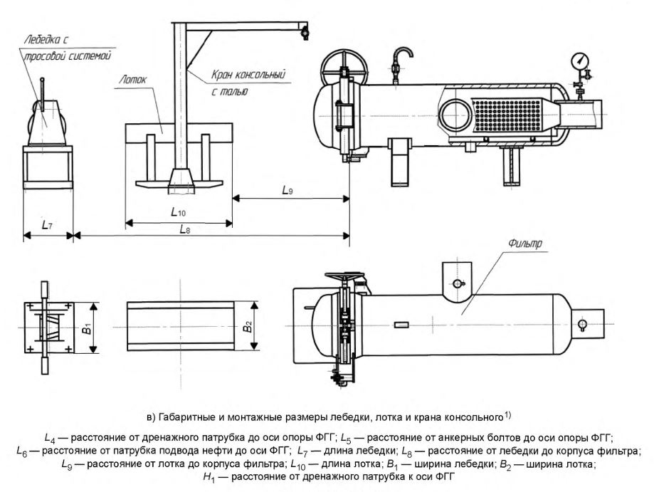 Например, фильтр грязеуловитель горизонтальный ФГГ номинальным диаметром DN 500 на номинальное давление PN 6,3 МПа, блочного исполнения, с осевым отводом нефти или нефтепродуктов, с левым расположением патрубка подвода нефти или нефтепродуктов, в сейсмостойком исполнении С по MSK — 64 [10], подлежащий теплоизоляции, вид климатического исполнения ХЛ1 по ГОСТ 15150 будет обозначаться следующим образом: ФГГ-500-6,3-Б-0-Л-С-Т-ХЛ1.